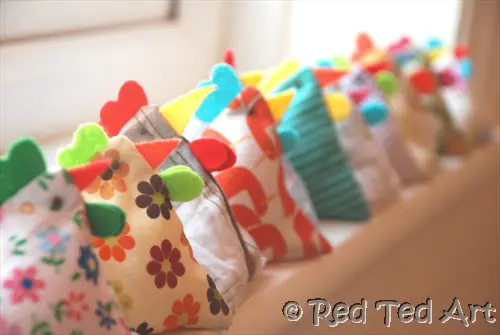 I love these juggling bag chickens! They are so cute and cheerful. They are designed to be used as juggling bags and would be great sold in a set at school fairs or children’s events. But they are so cute, I reckon you could also sell them individually as decorative objects! You can use pretty much any fabric scraps you have left over from other projects, so they can be super cheap to make too.