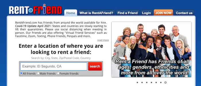 RentAFriend is probably the biggest paid friendship platform out there. As of April 2021 there are over 621,585 registered friends from all over the world!