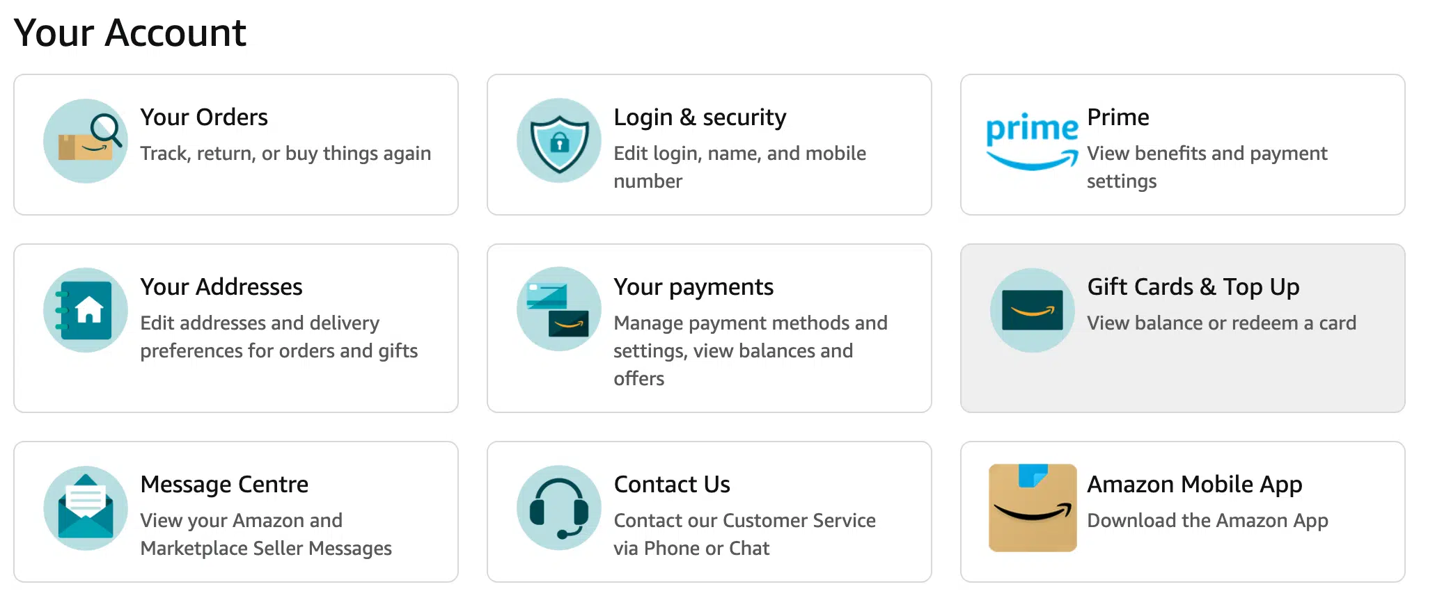7. In Amazon, go to your account and click on ‘Gift Cards & Top Up’. Then click ‘Top up your account’ and add a £5 gift card (or however much you have available in Zilch points).